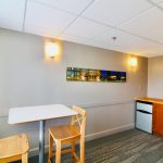 - 6th floor indoor lounge with kitchenette, bar-top table & chairs.